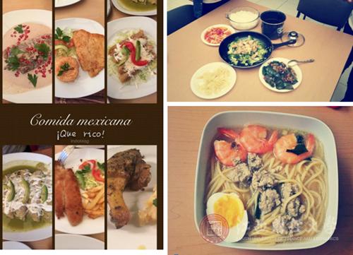 时常和寝室里来自另外的中国女孩一起做饭吃。寝室有电磁炉、微波炉,其他的工具就必须自己买了,然后选个柜子。每次东西只要从你的柜子取出来就好了。运气好,经常会遇到,墨西哥同学做菜给你吃的情况。
