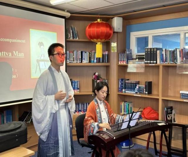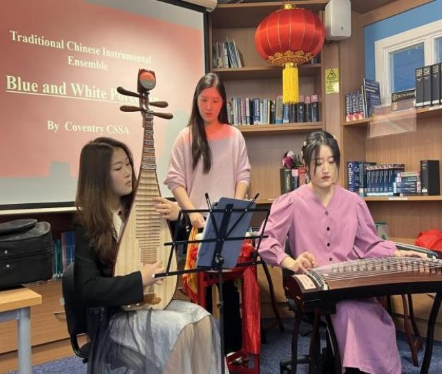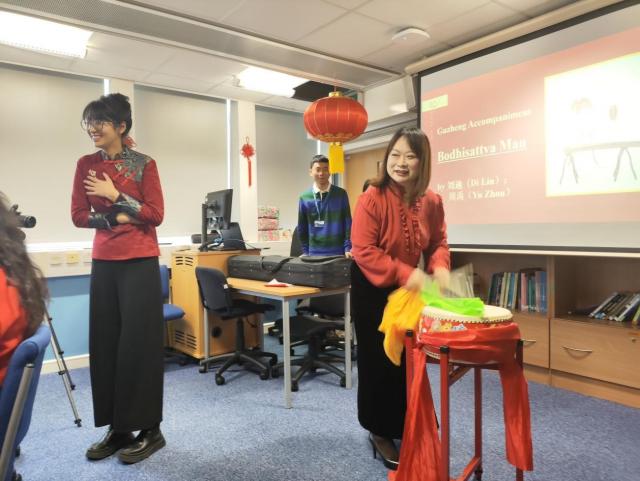 本次新春茶话会助兴节目精彩纷呈,考文垂大学学生学者联合会带来的中国传统乐器合奏《青花瓷》,拉开了欢聚的帷幕。古筝琵琶的畅畅乐音,伴随鼓点回荡于耳畔。孔院教师刘迪和周禹相互配合,为大家献上了古筝伴唱《菩萨蛮》,旋律明快,歌声悠扬。