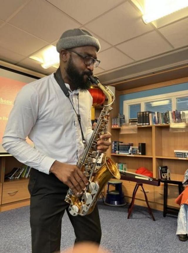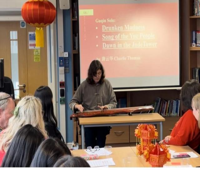 当考大优秀校友Usman用萨克斯吹响《月亮代表我的心》《喜欢你》等中国金曲串烧,熟悉的旋律让在场嘉宾不禁随着乐声一起合唱。孔院优秀学员唐云华(CharlesThomas)拂响具有百年古琴,《酒狂》《越人歌》等深沉与清越的经典曲目,抒发着或超脱世俗、或自由奔放、或内敛深厚的情怀,更是让嘉宾们近距离地感受到了几千年来备受中国文人雅士所亲睐的弦歌魅力。在茶话会主持人马殊亮老师的带领下,嘉宾们更是通过击鼓传花、猜灯谜、中英文化差异有奖问答等趣味游戏,感受热闹喜庆的中国新年。