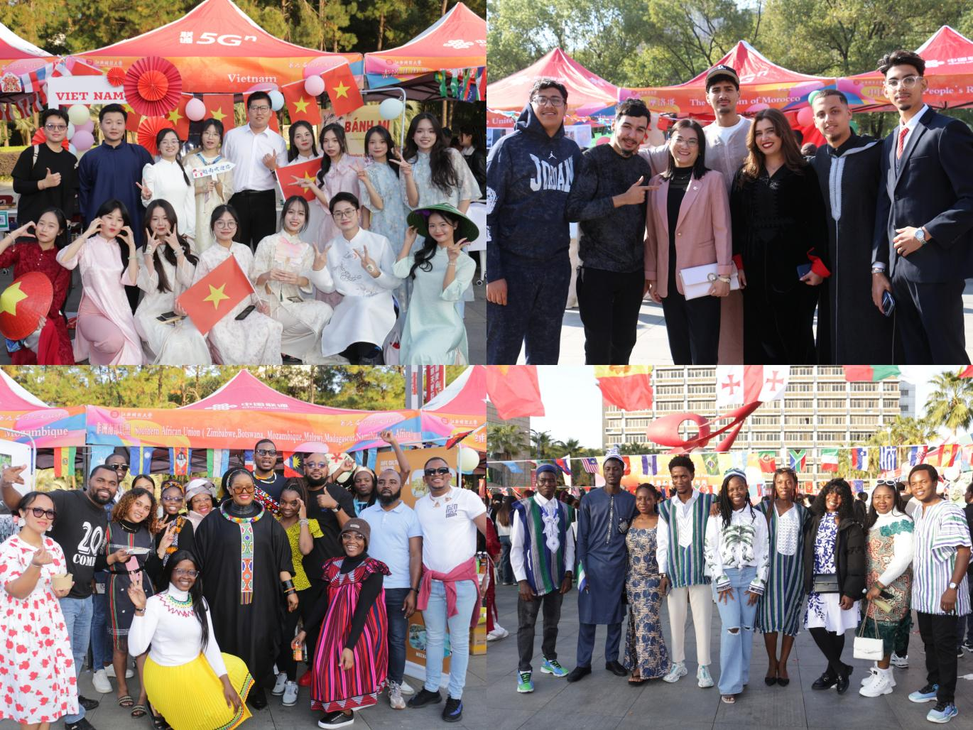 舞台两侧的国际风情展棚前人潮涌动、热闹非凡。中外学子身着民族服饰,通过特色美食展示、手工艺品陈列、互动游戏体验、文化讲解分享等多种形式,全方位呈现本国独特的风土人情与文化底蕴。师生们穿梭于各展棚之间,品尝异国风味美食,欣赏精美手工艺品,参与趣味民俗游戏,在沉浸式体验中领略世界各国的文化魅力。校领导与嘉宾漫步其间,与留学生亲切交谈,详细了解各国文化特色,亲手体验民俗活动,现场暖意融融。