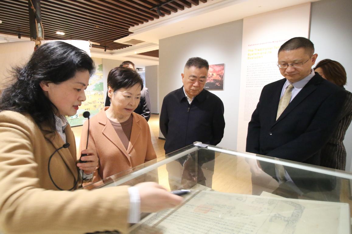 讲座前,林郑月娥参观了校史馆、中国税收票证博物馆,深入了解了学校发展历史和现状。