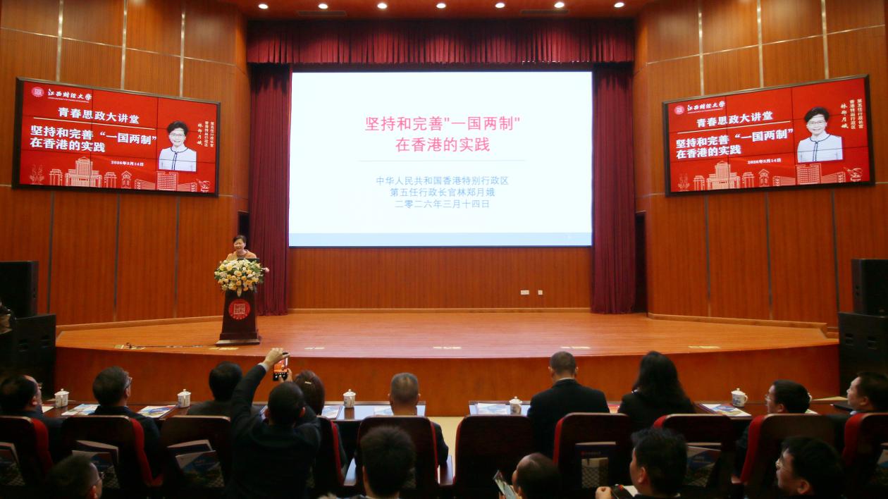 林郑月娥在题为“坚持和完善‘一国两制’在香港的实践”的主旨演讲中,全面阐述了全面准确贯彻“一国两制”方针对于确保香港长期繁荣稳定的关键意义。她结合历史背景、实践经验与个人感悟指出,中共二十大报告明确强调“一国两制”是香港长期保持繁荣稳定的最佳制度安排,必须坚定不移地长期坚持。林郑月娥表示,在担任香港特别行政区第五任行政长官期间,面对香港回归以来最为复杂严峻的挑战,香港特区政府在中央的坚强领导和全力支持下,严格依据《中华人民共和国宪法》和《中华人民共和国香港特别行政区基本法》有效施政,推动香港社会实现从由乱到治走向由治及兴的重大转变。她还表示对香港未来充满信心,强调香港将继续发挥“背靠祖国、联通世界”的独特优势,积极融入国家发展大局。演讲中,林郑月娥亦介绍了香港特区政府推出的多项人才引进计划,并欢迎江财学子赴港学习、工作和发展。