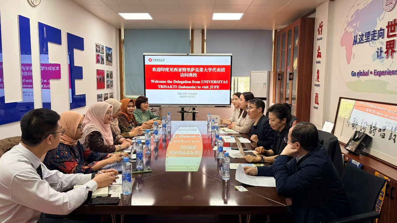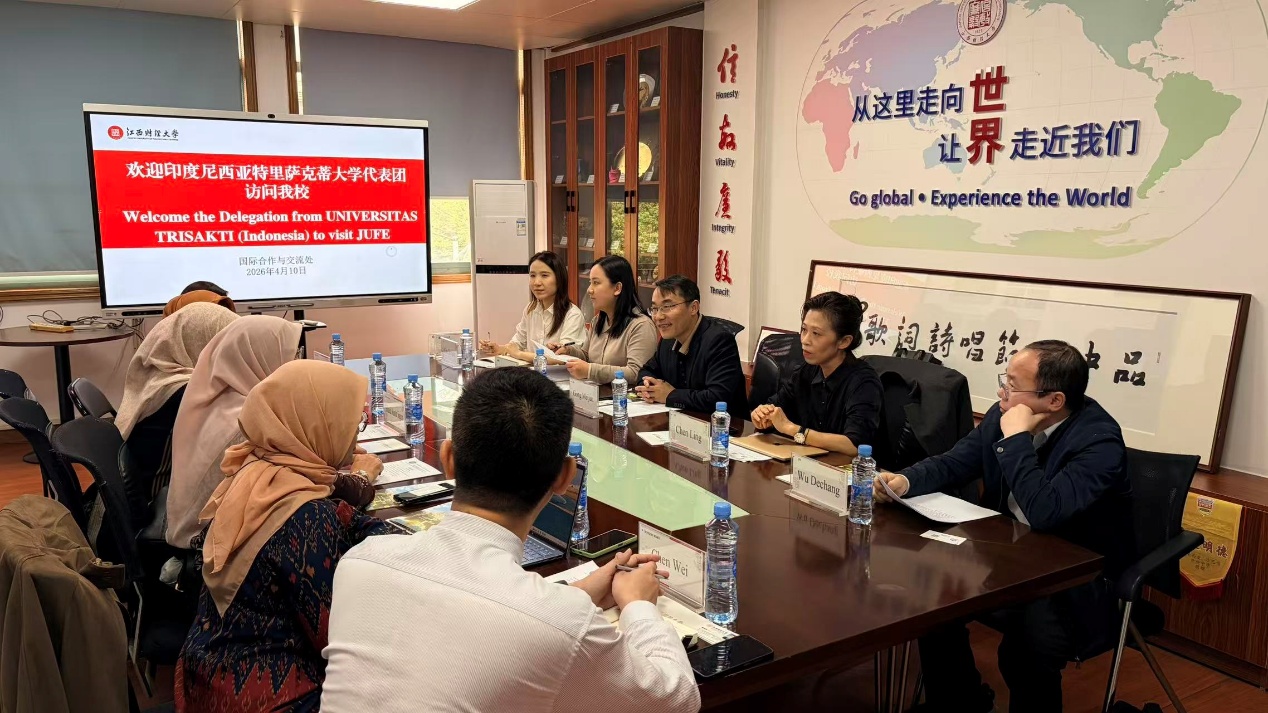 2026年4月8日,印尼特里萨克蒂大学(UniversitasTrisakti)代表团来校访问交流,我校国际合作与交流处、经济学院与法学院相关负责人热情接待代表团,双方就两校教育合作、学术交流等事宜进行深度洽谈,印尼Starzin教育咨询公司总经理谌威陪同来访。